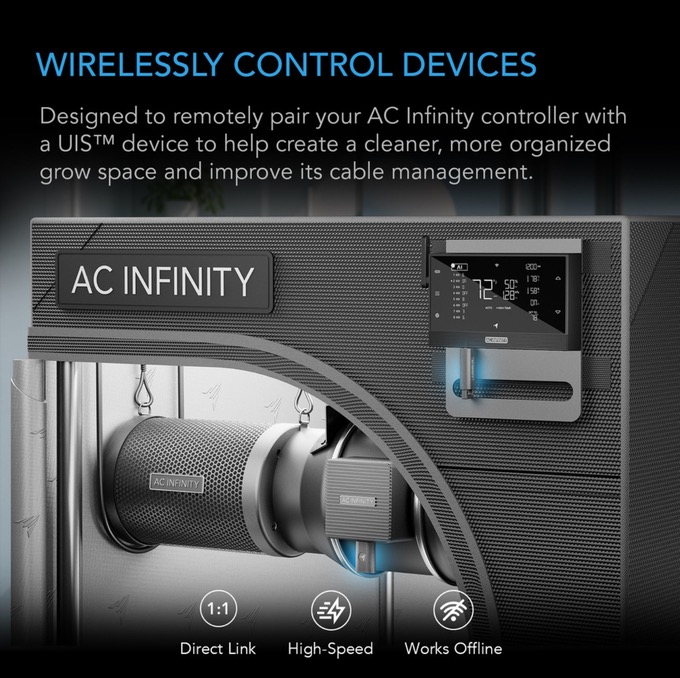 Wirelessly connects AC Infinity controllers to UIS fans, lights, and smart devices for organized, cable-free grow spaces.